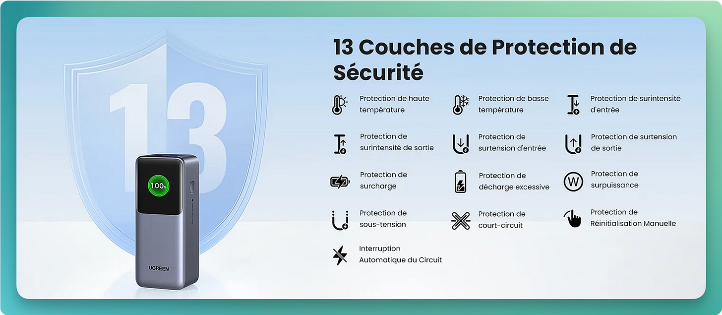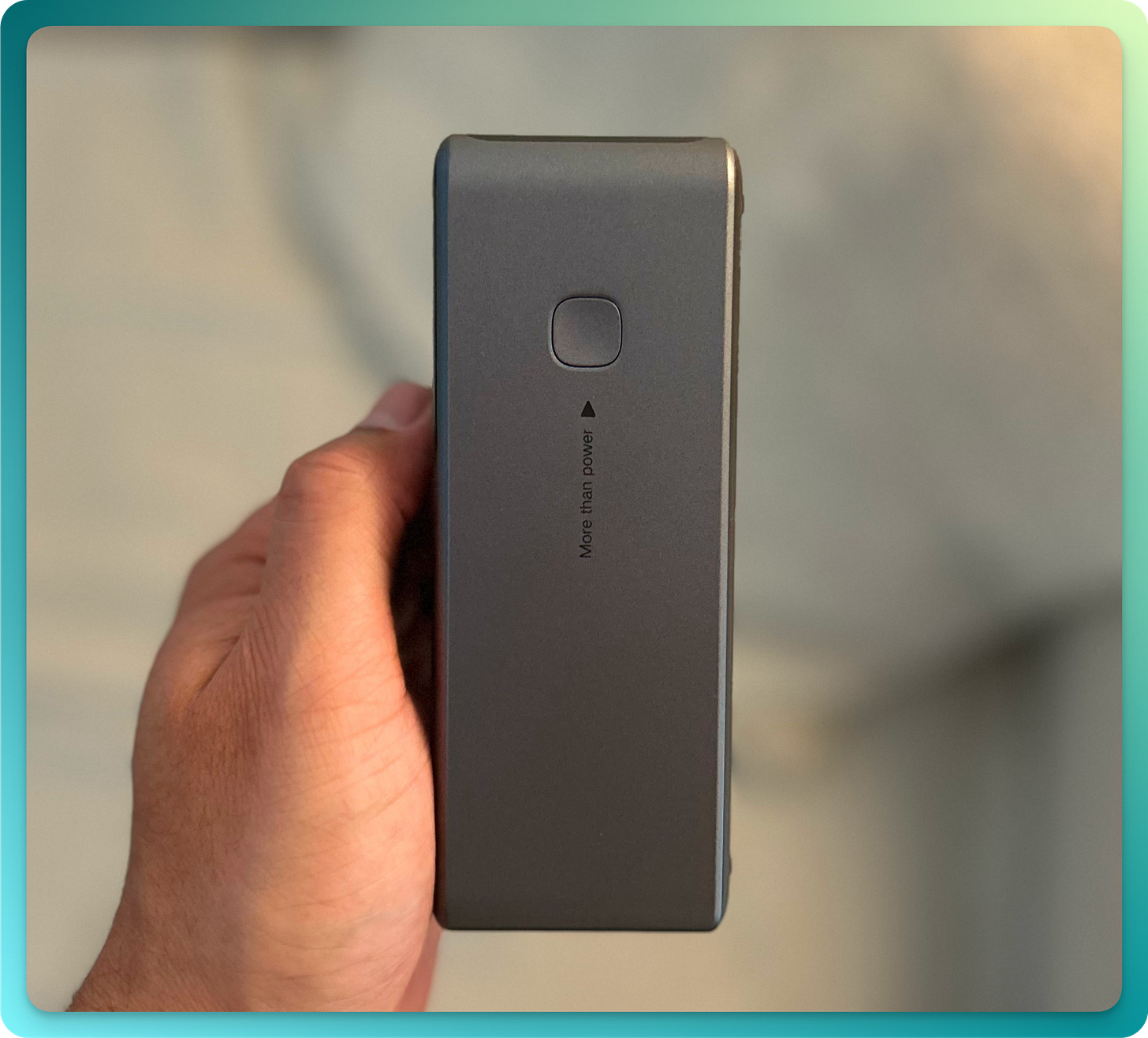 Elle intègre aussi un mode de charge que UGREEN appelle “Charge à faible courant” et qui permettra de recharger vos plus petits appareils (écouteurs sans fils, montres connectées). Pour ça, il suffit d’appuyer et de maintenir le bouton pendant 3 secondes et vous verrez le petit indicateur en haut à gauche de l’écran. Encore une fois très utile pour éviter d’abîmer prématurément la batterie de vos équipements.