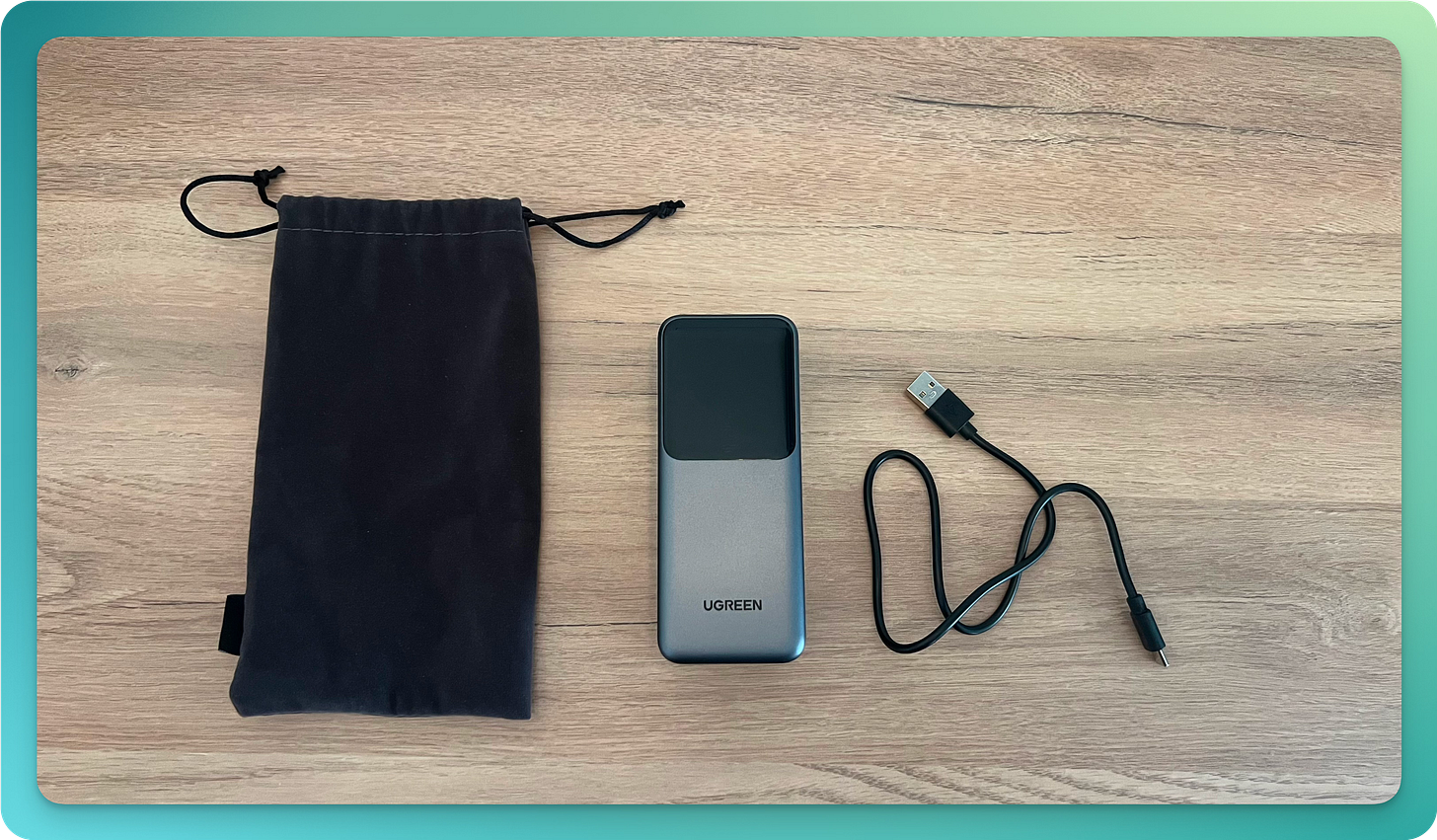 UGREEN livre sa batterie avec sa housse de protection ainsi qu’un câble USB-C vers USB-C pour pouvoir recharger la batterie.