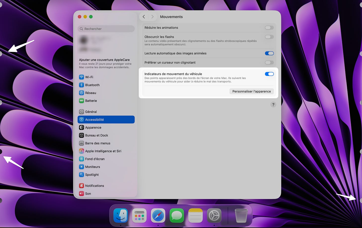 Vous pouvez maintenant activer une option dans les réglages de votre Mac pour faire apparaître des points sur le bord de l’écran (leur nombre et leur couleur sont personnalisables) afin que ces derniers se déplacent sur le bord de l’écran en fonction des mouvements de la voiture pour contrer l’effet nauséeux.