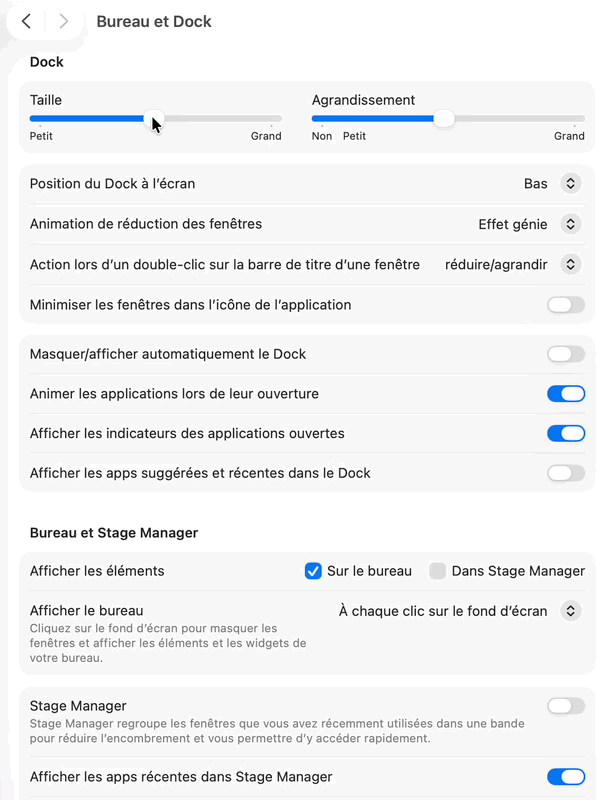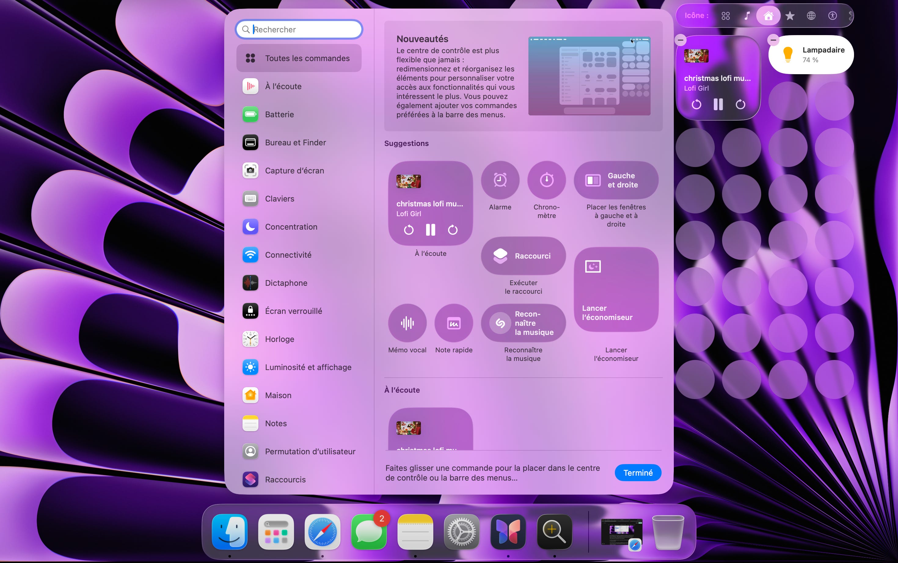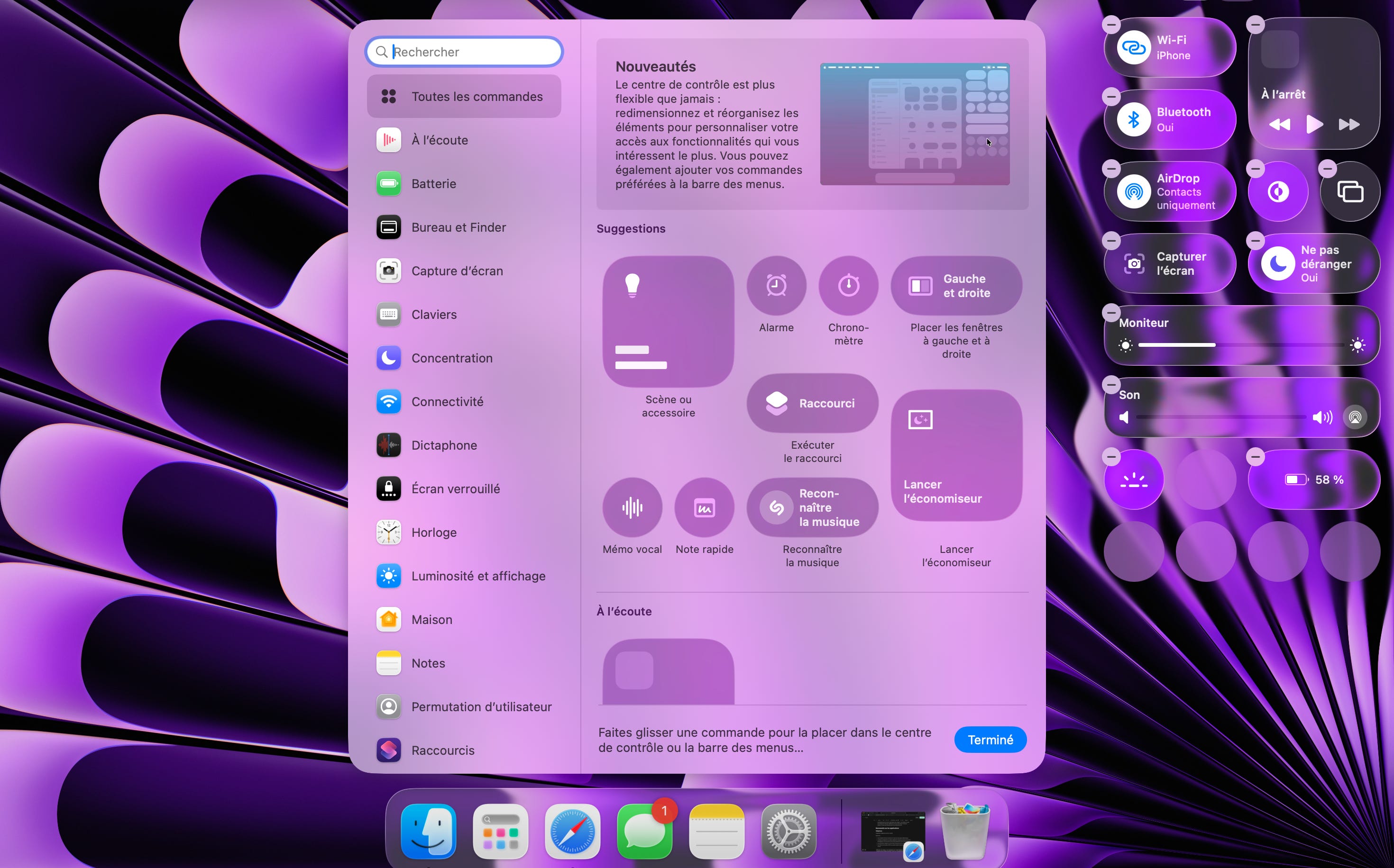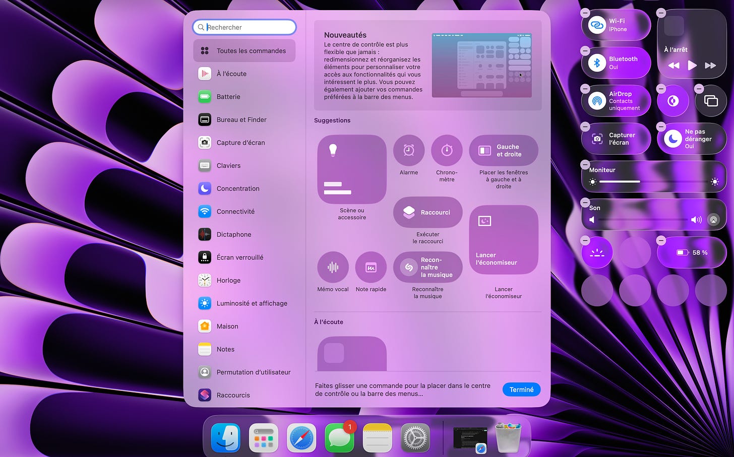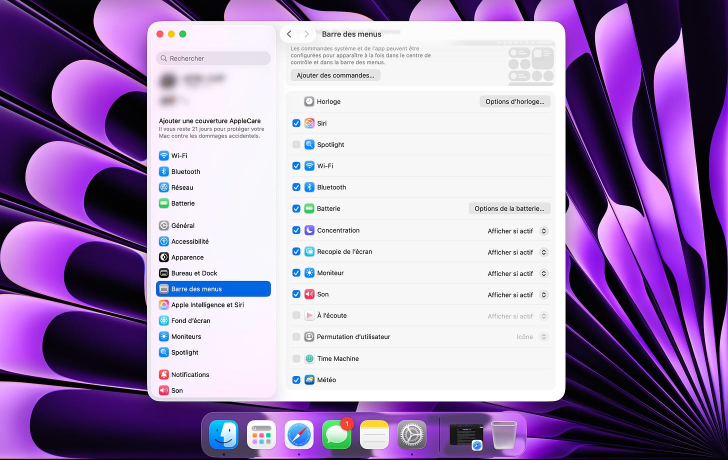 Un des éléments qui a pas mal évolué sur macOS Tahoe 26 également, c’est la barre de menu (celle qui se trouve en haut de l’écran). Vous avez désormais la possibilité de modifier les commandes du centre de contrôle, ce qui inclus : retirer des éléments, les agrandir ou les rétrécir (petit, moyen, grand), les déplacer dans le centre de contrôle, en ajouter et en supprimer.