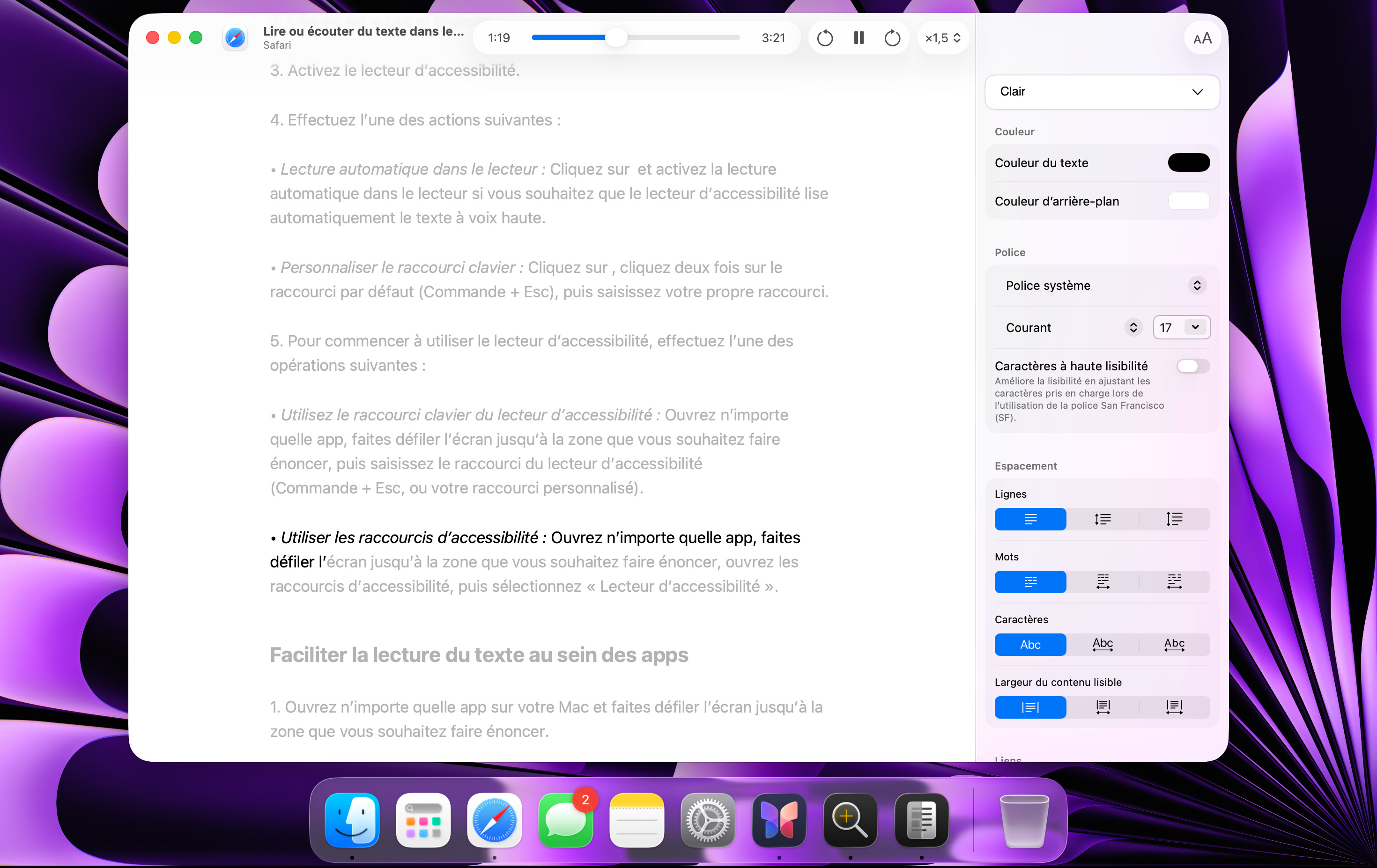 Cette fonctionnalité dans les réglages d’accessibilité permet d’adapter le texte que vous êtes en train de lire. Vous pouvez activer l’énoncé vocal pour que le texte vous soit dicté mais vous pouvez également modifier le texte lui-même (couleur, police, arrière plan, etc).