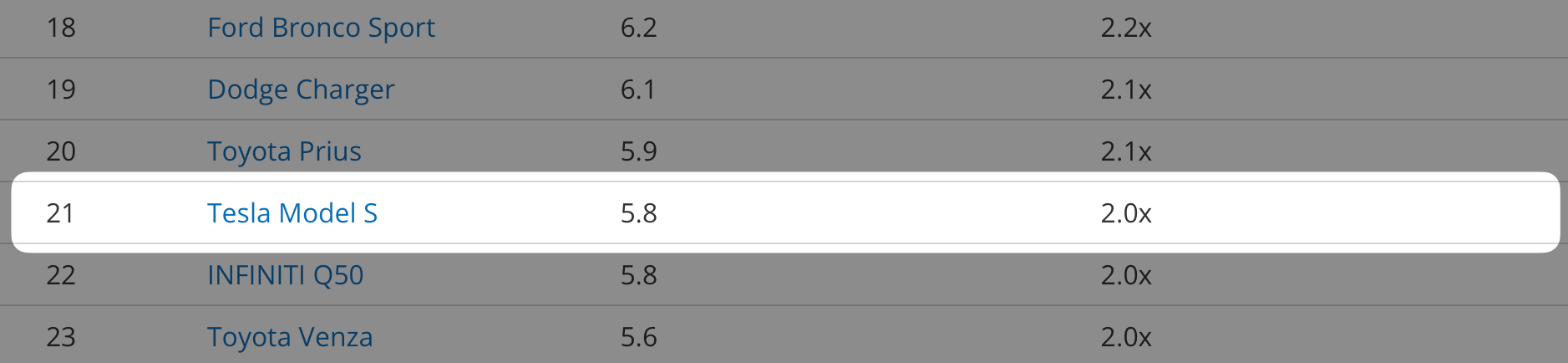 On retrouve également deux modèles Tesla : le modèle Y et le modèle S, se classant respectivement à la 6ème et à la 21ème place des modèles de véhicules ayant le taux d’accident mortel le plus élevé* avec un taux 3,7 fois et 2 fois supérieur à la moyenne constatée.