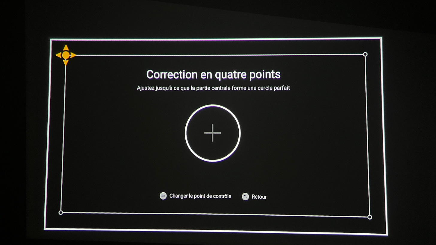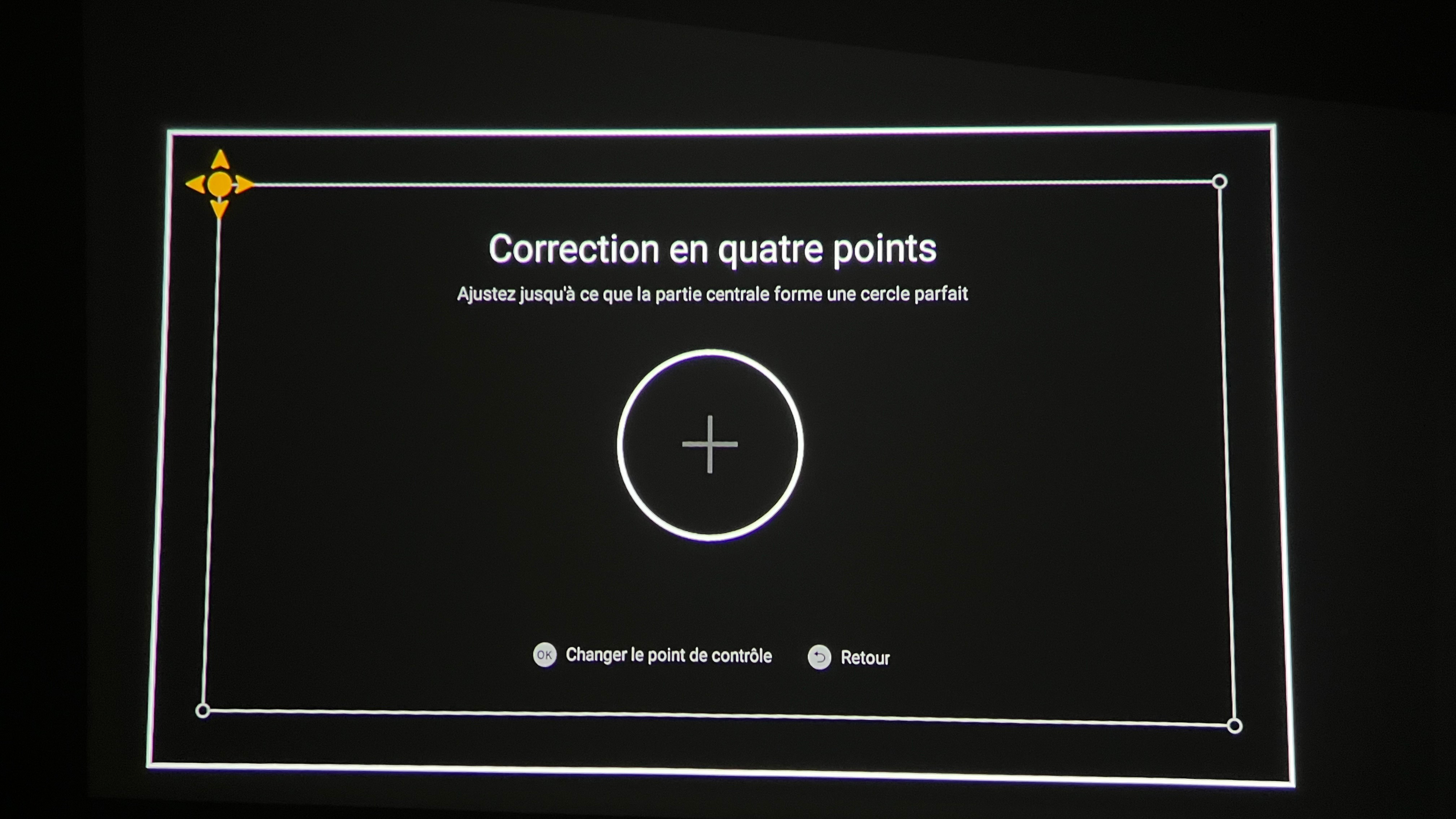 À noter tout de même, bien que la correction trapézoïdale automatique fonctionne, c’est assez souvent que je dois aller dans les paramètres pour effectuer la correction en quatre points manuellement pour avoir une image bien équilibrée de tous les côtés car il arrive que la correction ne se fasse pas toujours proprement.
